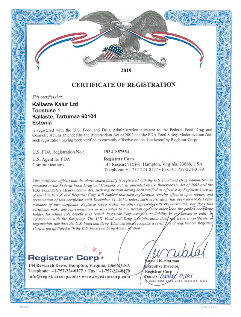 OÜ Kallaste Kalur on pälvinud mitmeid sertifikaate Eestis ja teistes riikides, mis annavad klientidele kindluse, et tegu on kvaliteetse toodangu ja vastutustundliku tootjaga.